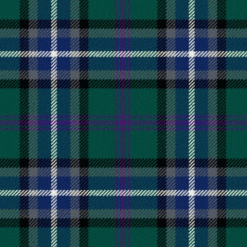 This tartan features a striking pattern characterized by purple, green, black, gray, white, and blue, representing the lush Scottish landscape and the clan's connection to nature. The use of green throughout signifies strength and resilience, while blue elements symbolize dignity and sophistication. Crafted from 100% acrylic wool, this tartan offers both durability and comfort, making it perfect for various occasions.
