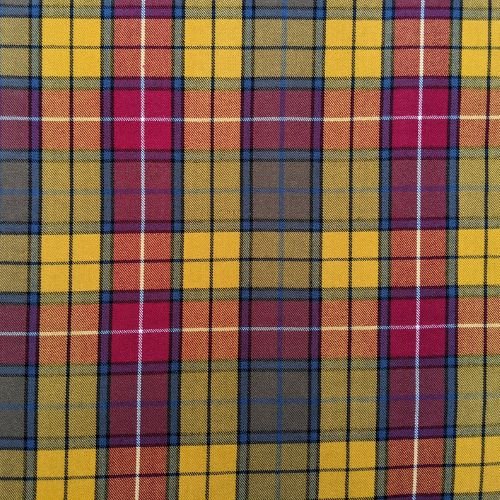 The Buchanan Weathered Tartan showcases a vibrant color palette with mustard yellow, rust red, and olive green, interwoven with dark blue and brown tones. The pattern is highlighted by thin black and white lines, adding a sharp contrast to the warm and earthy colors. Each hue in this tartan reflects the natural beauty and rich heritage of the Scottish landscape, making it a bold and timeless choice. Crafted from 100% acrylic wool, this tartan ensures both durability and comfort, perfect for any occasion.