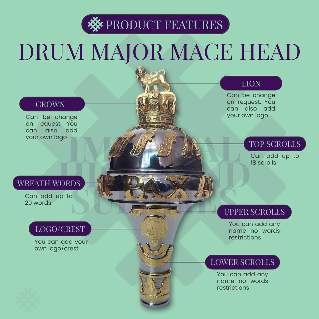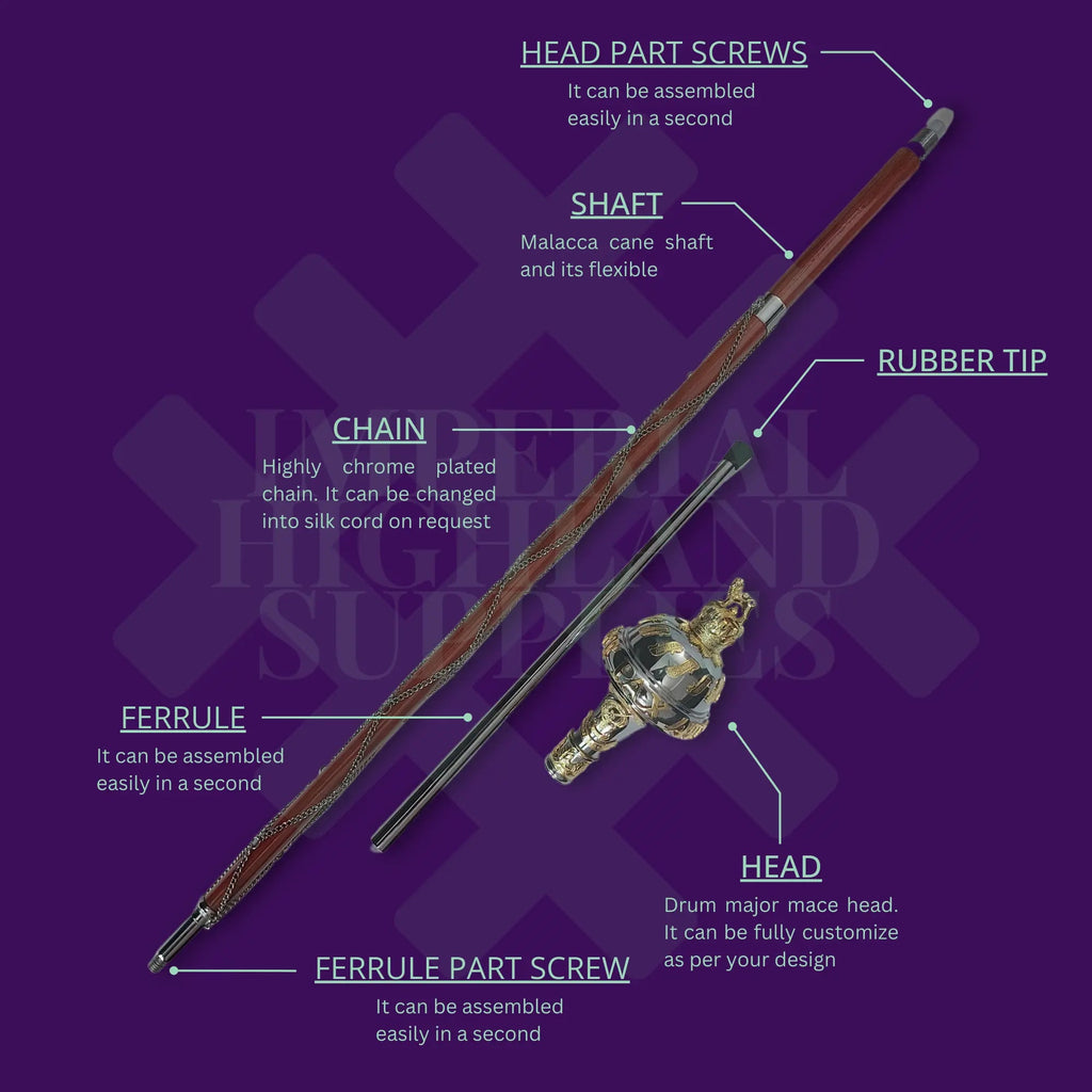 EXCEEDINGLY RARE PERFECTION, EXTRAORDINARY CUSTOM MADE DRUM MAJOR CEREMONIAL MACE FROM THIS OUTSTANDING, EXCEPTIONALLY KNOWLEDGEABLE, EXPERIENCED & EXPERT DEALER! IMPERIAL HIGHLAND SUPPLIES' SUPERB & DISCERNING TASTE & SOPHISTICATED EYE FOR THE VERY BEST QUALITY, HANDSOMENESS, AND IMPORTANCE, HAVE BEEN ABLE TO CREATE AN INTERNATIONAL ELITE & MILITARY FOLLOWING SEEKING THE MOST EXQUISITE, STUNNING & SOUGHT AFTER CUSTOM DRUM MAJOR CEREMONIAL MACES & MANY OTHER ACCESSORIES !